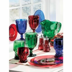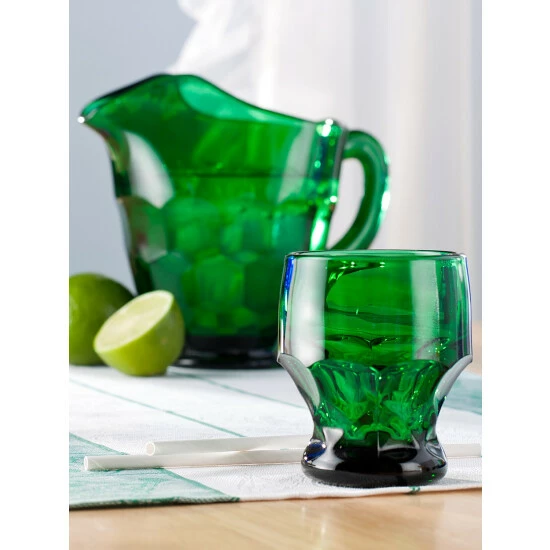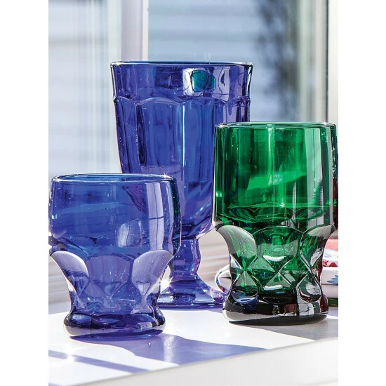 After following his father into the glass business as a teenager and learning the business from the bottom up, Thomas Mosser’s dream of opening his own glass company in the Midwest was finally realized decades later when he opened Mosser Glass in 1971. Mosser’s passion for working with glass and his commitment to quality is reflected in both the beauty and rich details that embody this masterfully crafted Georgia-pattern glassware. Each thick, durable piece is made using original molds and features a classic “thumbprint” design for easy handling. We’re offering this Mosser glassware in three deeply vibrant colors—cobalt blue, emerald green, and ruby red. Red glass is a bit trickier to make than the blue or green as is contains a rare element, selenium, which accounts for its rich ruby color and slightly higher price.