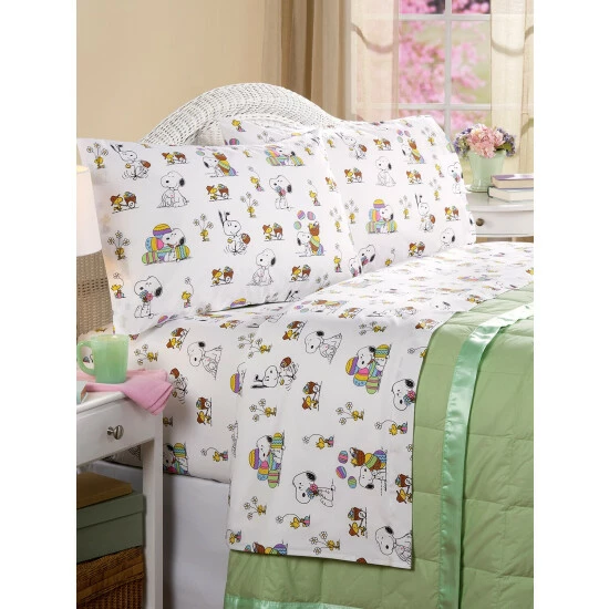 Snoopy and Woodstock couldn’t be more “egg-cited” about Easter! They want to share their collection of colorful Easter eggs with you as they parade them across these premium percale sheets. Woven in Portugal using the finest cotton, the sheets are soft and dreamy with a 200 thread count, which is the perfect weight for comfortable sleeping in every season.