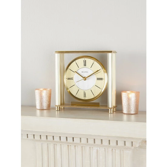 The shimmery brass case of our Ansonia clock makes it an elegant (and functional) timepiece for your home. It features a floating two-tone metal dial and whisper-quiet sweep secondhand protected with a clear lens. The dial stands out with black Roman numerals at 3, 6, 9, and 12 and black bars in place of the other numerals. The brass hands, case, and face give this clock a contemporary look.