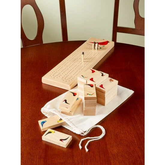 Come game night, birds of a feather flock together to entertain your family with this bird lover’s cribbage and dominoes set. Both games are crafted here in the Green Mountains using sturdy locally harvested, sustainable hardwood maple and are beautifully decorated with colorful songbirds. The cribbage set includes a cribbage board, six pegs, and instructions. The domino set includes 28 dominoes, instructions, anda cloth pouch for storage.
