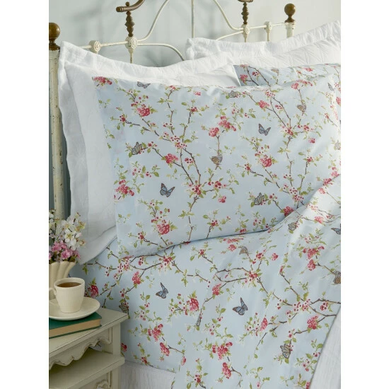 Our percale sheets are woven in Portugal from the finest cotton for sheets with a cool, crisp feel that’s second to none. The 200-thread-count sheets are luxuriously smooth with a weight and heft that’s comfortable for year-round use. The inviting butterfly print with its soft blue background and sweet cherry blossoms lends a fresh touch to any decor. Extra set of two standard pillowcases is available separately.