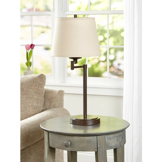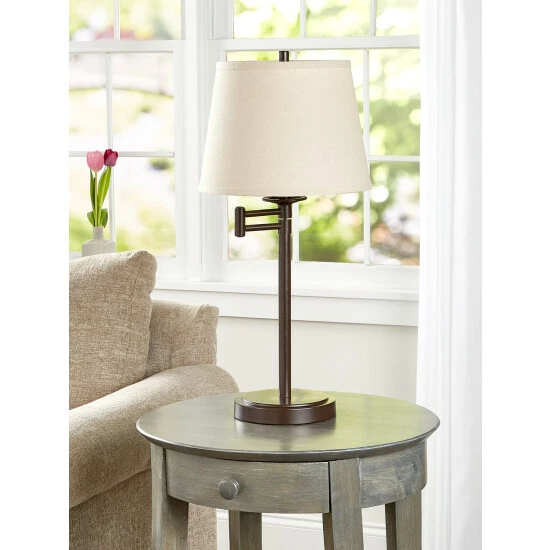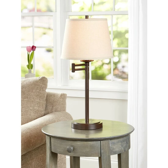 This is one hard-working lamp because it combines three lighting levels with a versatile swing arm to put the light where you need it. Set it at low light for an accent lamp, swing the arm over your chair, turn it up for a reading light, and turn it to the highest setting for fine hobby work. A weighted base prevents it from tipping over.