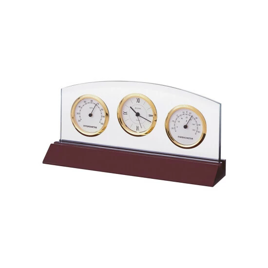 This triple-duty clock features a glass panel with a beveled top and an accurate quartz-movement clock, a thermometer with Fahrenheit and Celsius scales, and a hygrometer. Each dial has polished brass bezels and clear protective lenses, and the entire unit is cased in a rich mahogany-finished wood base. It’s the perfect addition to any home or corner office!