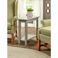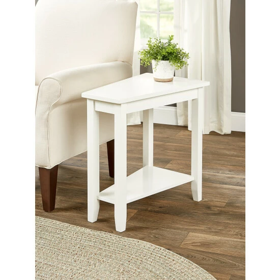 With its distinct shape, this side table fits perfectly between two chairs, allowing you to slightly angle them toward one another and create an intimate conversation space. It also adds a touch of country charm to any small or tight space. The table is sturdily constructed of rubberwood and features a lower shelf and Shaker-style legs.