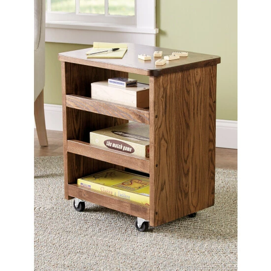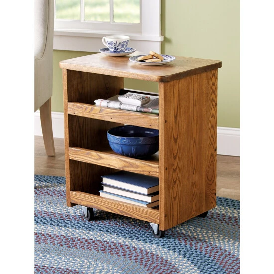 Our Everywhere Table lives up to its name! It fits just about anywhere and rolls easily, even over low carpets, on its sturdy caster wheels. The three open-ended shelves have raised edges to keep papers, books, and magazines securely in place. And the spacious tabletop gives you plenty of room for beverages, meals, craft projects, and more. Best of all, it’s crafted here in the USA!