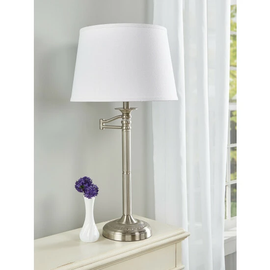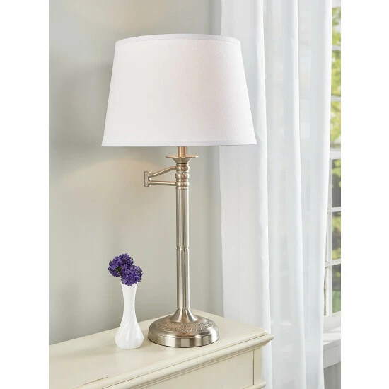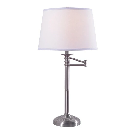 This lamp incorporates all the useful features we love in a swing arm lamp: a three-way switch, an arm with a six-inch reach, and a weighted base to keep it steady when it’s extended. But it also has a few modern design touches, like a decorative “reed” column, slightly tapered shade, and beautiful brushed steel finish. It’s slightly taller than many table lamps, so it works well with lower tables. A good choice for home, office, or your home office.