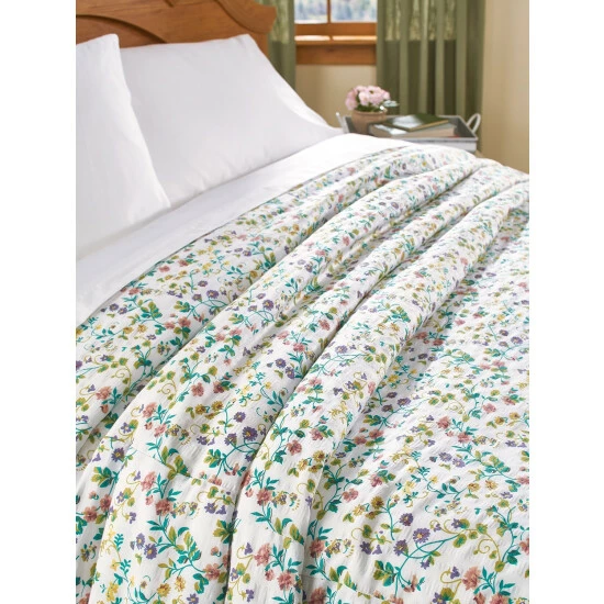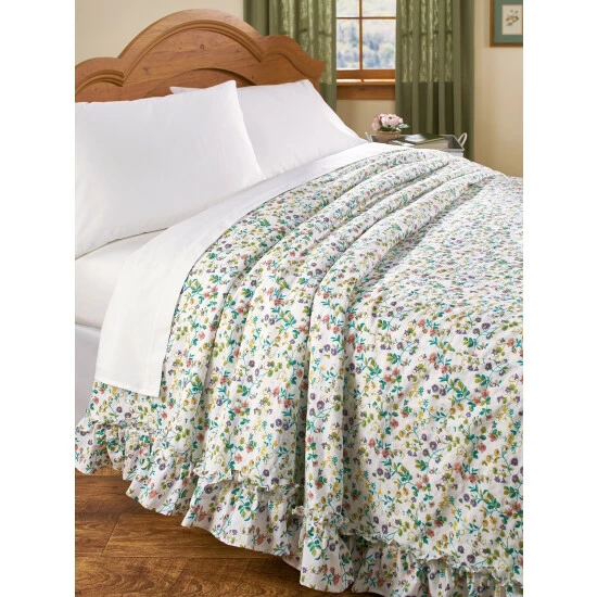 As kids, it seemed to us like everyone had plissé bedspreads on their beds. Today, we still appreciate the virtues of plissé, an underrated and now hard-to-find fabric. We’re pleased to offer you this lightweight plissé floral bedspread with a pretty ruffle on 3 sides. Polyester/cotton blend. Machine wash and dry. Imported.