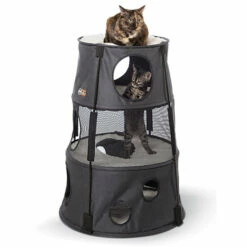 This cat play center has four levels for cats to romp in, with windows to peek out of and walls to climb. It’s very sturdy but also very lightweight. That means you can move it from room to room so cats don’t get bored with it. You can even fold it down and store it away for a while, then bring it back out to delight them all over again.