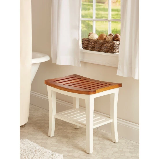 This versatile bench can be used indoors or out and as a meditation bench or for use in the spa, shower bath, or on your deck or patio. It’s beautifully crafted from natural teak wood—one of the most beautiful and durable types of wood in the world—with an elegant curved design and a wider, comfort-minded seat. Teakwood is naturally impervious to water and mildew, which makes it a great choice for indoor and outdoor use. The slatted bench has a lower shelf that’s the perfect place to store towels or bath necessities.