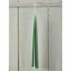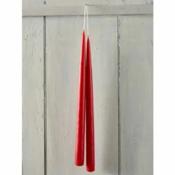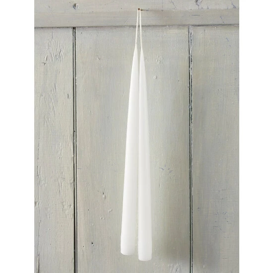 These hand-dipped tapers are created by a New England candlemaker who still uses the Old-World technique of patiently layering one layer of wax on at a time. He starts with pure cotton wicks and dips two candles at a time, which is why the end result is two candles connected by one wick. Each taper is a blend of premium wax and beeswax and is about 13″ long. Unscented candles burn for approx. 9-1/2 hours.