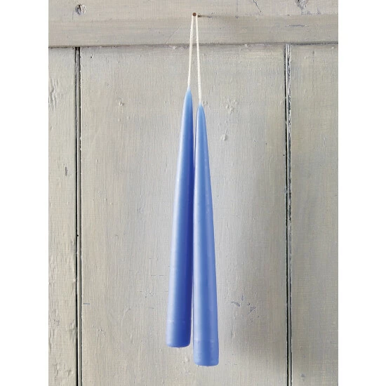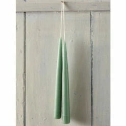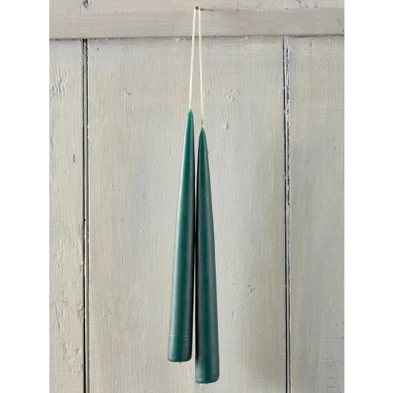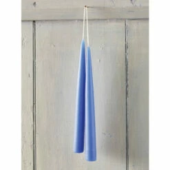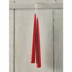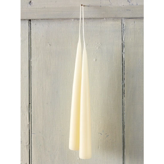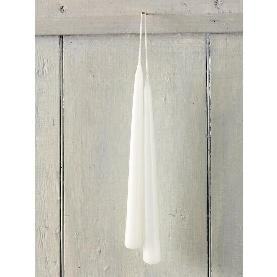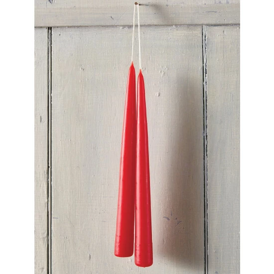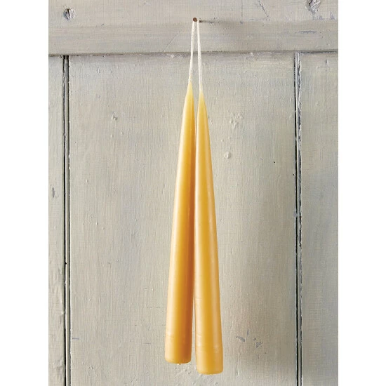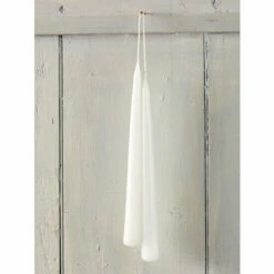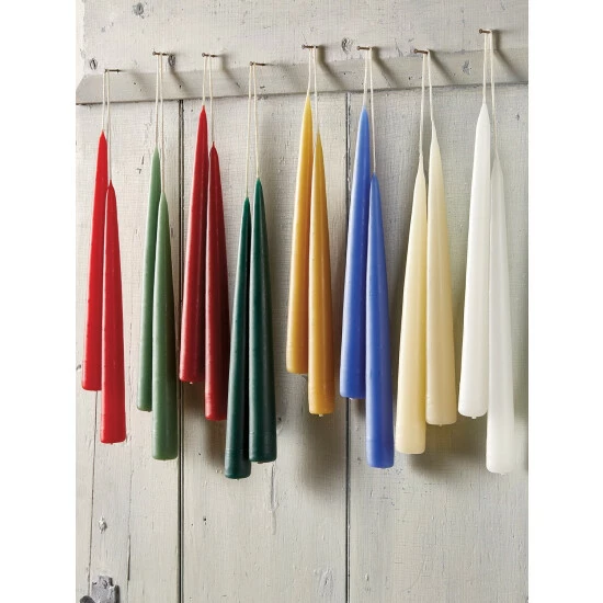 These hand-dipped tapers are created by a New England candlemaker who still uses the Old-World technique of patiently layering one layer of wax on at a time. He starts with pure cotton wicks and dips two candles at a time, which is why the end result is two candles connected by one wick. Each taper is a blend of premium wax and beeswax and is about 9″ long. Unscented candles burn for approx. 7 hours.