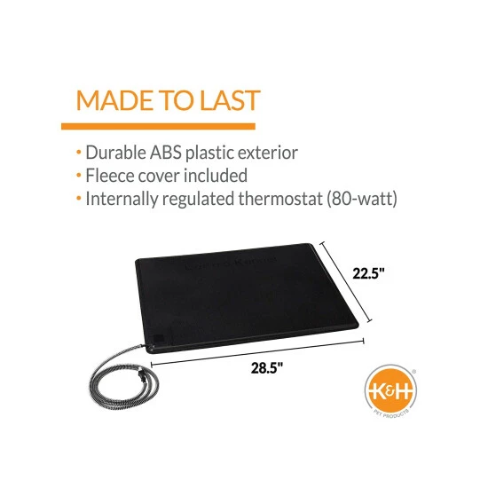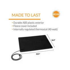 Superior heating technology ensures that this pet pad is equally warm from corner to corner. But never too warm, because the heating element is thermostatically controlled; it heats only to the pet’s natural body temperature, and only when it is occupied. It’s made of extremely durable moisture-sealed ABS plastic and will handle any conditions short of direct rain or snow. Even the power cord is steel-clad so there’s no chance of Fido chewing it.