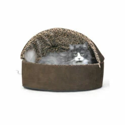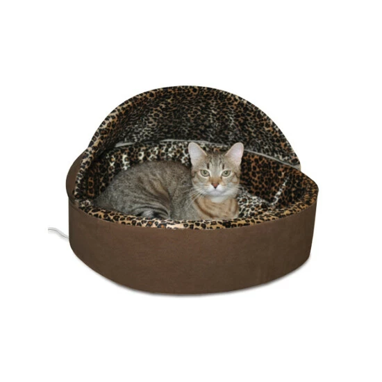 Cats feel safe and at ease when their backs are covered and this cat bed has a half-dome cover that makes kitty feel covered without obstructing her view. It has a dual-thermostat heating unit buried in the thick polyfill base, which keeps the surface of the bed 10 to 15 degrees above the ambient air temperature. When your pet lies on the bed, the thermostat automatically adjusts to your pet’s normal body temperature. In tan or mocha with a stylish leopard-skin interior, of course.
