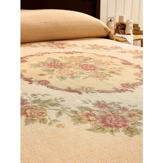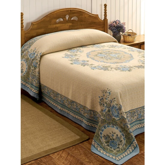 This bedspread is richly woven and beautifully crafted—just like the tapestries created for royalty centuries ago. It’s beautifully designed with a regal center medallion and decorative border that’s intricately woven with roses, greenery, and scrollwork. With its hefty weight and quality hand, it only takes one touch to know that this bedspread is made to last.