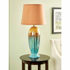 This lamp is a work of art, with a simple curved shape complemented by a Southwestern-inspired drip glaze. The color combination, a honey-and-bronze color over a mottled teal/celadon, is breathtaking, and no two will be exactly alike.