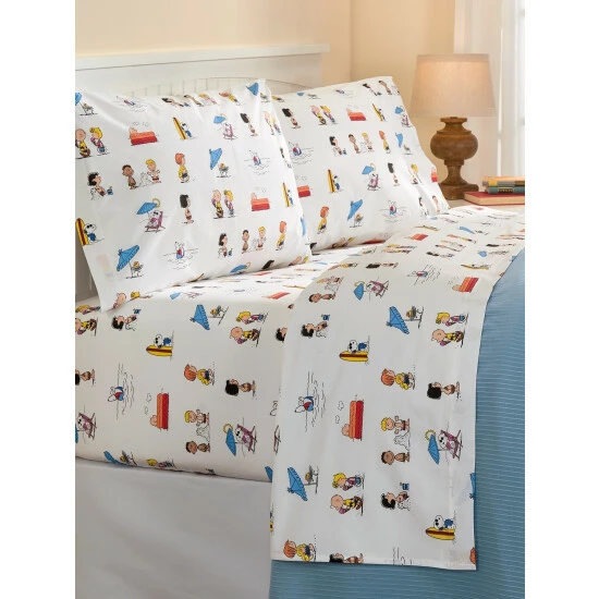 Dreaming of spending a day at the beach? You’re not alone, so are Charlie Brown, Snoopy, Woodstock, and the rest of the Peanuts gang as these premium percale sheets so delightfully depict. Woven in Portugal using the finest cotton, these 200-thread-count sheets are soft, comfy, and the perfect weight for snuggling under all season long.
