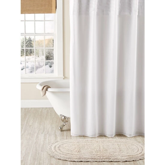 You might recognize the elegant design of this shower curtain from the coordinating Portico Pleats Curtain Collection. It has the same tuxedo pleating on top and a beautifully draping sheer panel. To make it a shower curtain, we added an attached water-repellent liner and self-closing easy-glide tabs. with the addition of the liner and attached tabs, you won’t need to add a separate liner or shower curtain rings—it’s a one-and-done shower curtain!