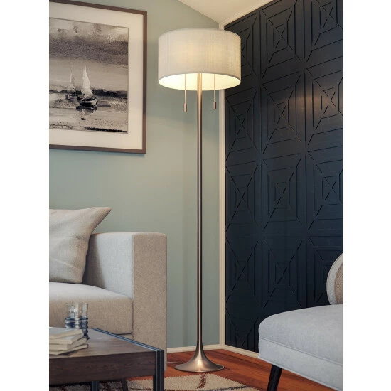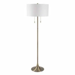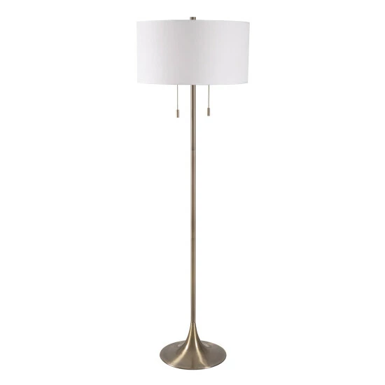 The perfect area lighting for your den or reading nook, this lamp can provide a little light for ambiance or plenty of light when you need it for reading, crafting, etc. Decorative pull chains mean you don’t have to reach up under the shade to switch on or off. A modern trumpet-shaped base and crisp drum shade give this lamp a fresh modern style.