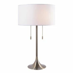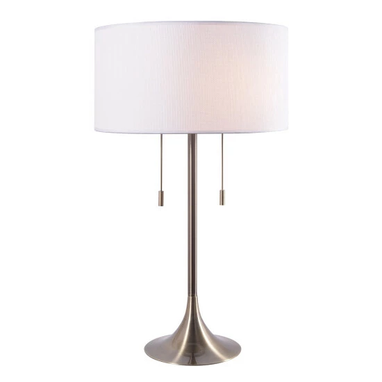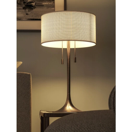 This dual-bulb lamp lets you light one side, the other side, or both, without having to reach up under the shade. It has a pretty trumpet pedestal and a crisp drum shade; even the chain pulls are elegant. Our favorite use for this style of lamp is on a table between two comfortable reading chairs.