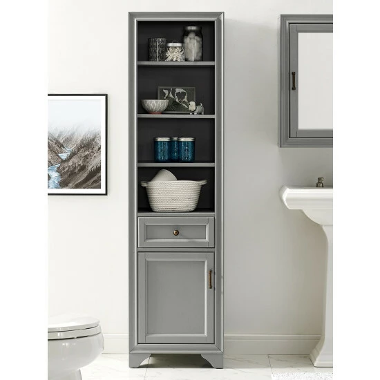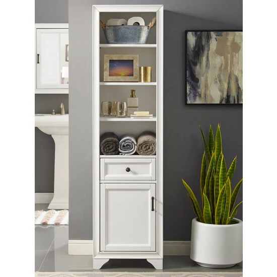 This cabinet brings much-needed storage space—even when space is at its tightest. It has a slender profile and utilizes vertical space to provide room for towels, toilet paper, skincare products, and more. It’s sturdily constructed of manufactured and solid wood and features four shelves, a drawer, and a spacious bottom cabinet.