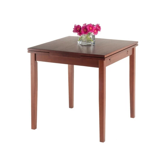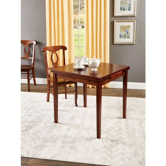 This extension table is a smart solution for small space dining. It tucks into any kitchen corner or breakfast nook and offers intimate seating for two. To make space for four diners, just pull each side to extend the table to 48 inches—no hunting around the attic or basement for those missing leaves. Solid wood in a nice, neutral walnut finish.