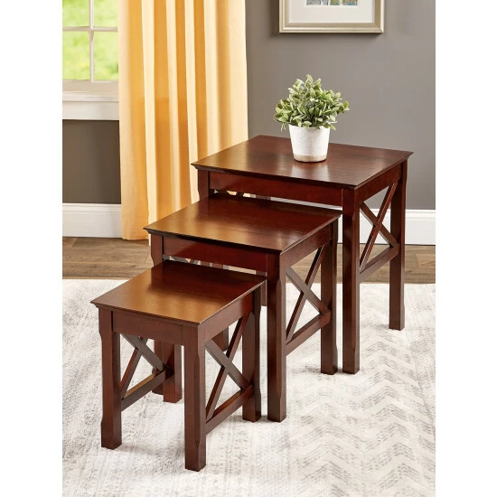 A set of nesting tables is one of the smartest items you can have when your living space is limited. They tuck out of the way in a hallway or corner of the living room until you have company. Then they appear as if by magic, giving every guest a place for drinks and snacks. This set is made of solid wood with cross braces that add a touch of Craftsman style and prevent the wobble some nesting tables have.