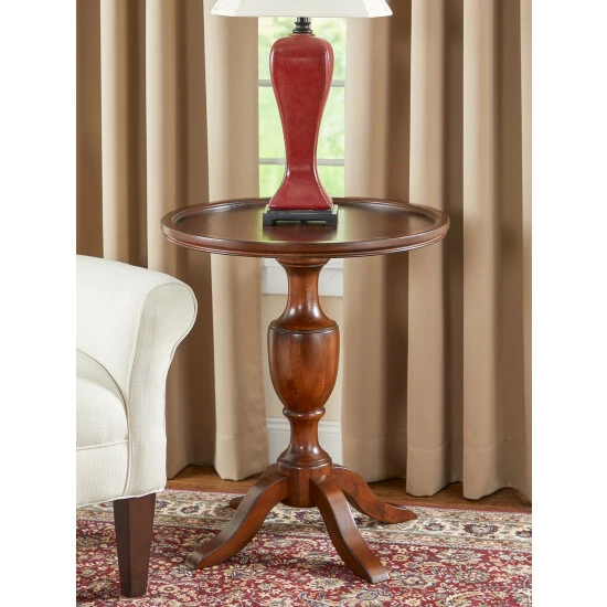 This lovely wood table with its timeless elegance and beauty has the look and feel of an antique, right down to its authentically distressed finish. It features a regal urn-shaped design with beautifully curved legs for added flair. It’s the perfect piece to add to a breakfast nook or to dress up a living room or foyer.