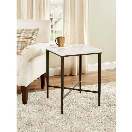 This understated end table is refined and well-crafted. It features a simple yet sturdy metal frame and a polished Carrara marble top, which together create a sleek, elegant piece. It’s ideal for any room and makes a beautiful nightstand as well.