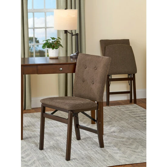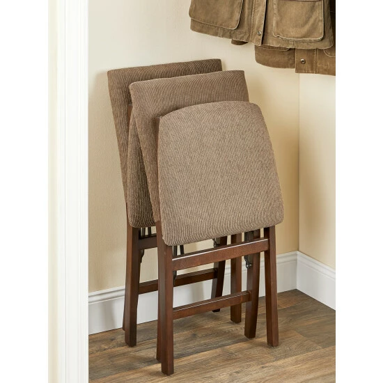 Friends and family will never guess that these upholstered chairs are actually folding chairs. They’re made of solid hardwood with a fabric-covered foam seat and back—and a sturdy metal folding mechanism. When not in use, these chairs fold up easily for storage.