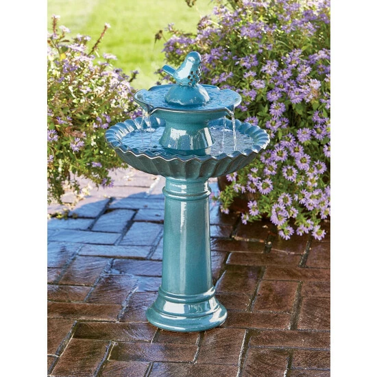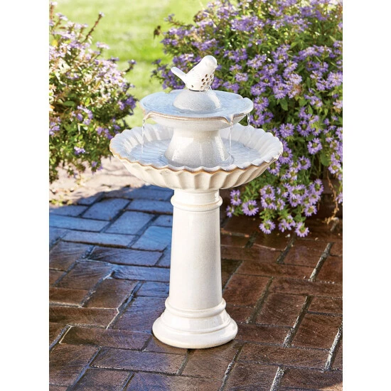 This ornate garden accent combines the tiered look of an Italianate fountain with a traditional birdbath design. It’s made of genuine ceramic and has a hidden silent pump that creates a gentle trickling sound that’s soothing and meditative. And it really does bring in the birds, just keep it filled and wipe the basin clean occasionally.