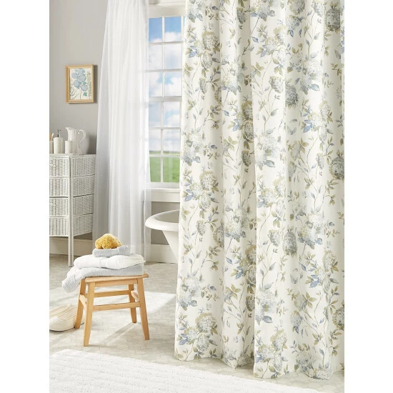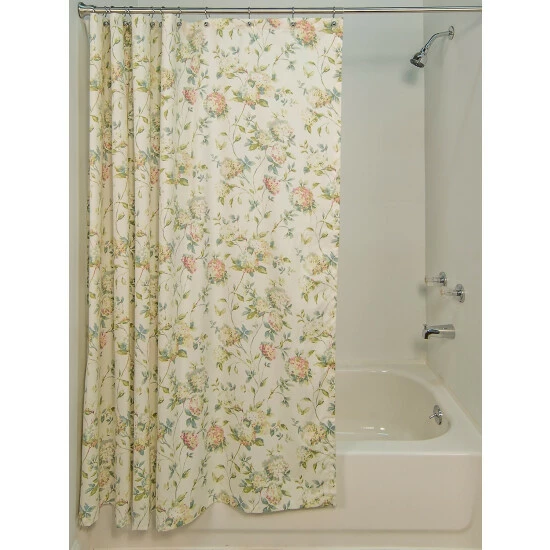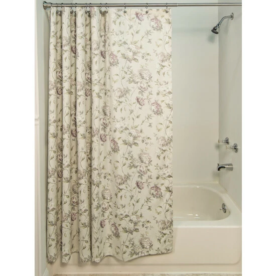 When you can’t wait for summer…put up this flowery shower curtain abloom with pretty clusters of soft lilac, blue, and pinkhydrangeas. The pearly white background is awash with these beloved old-fashioned blooms, whichlend vintagecharm to your bathroom. And the fabric is a durable cotton/polyester blend, which is easy to care for and colorfast, too.