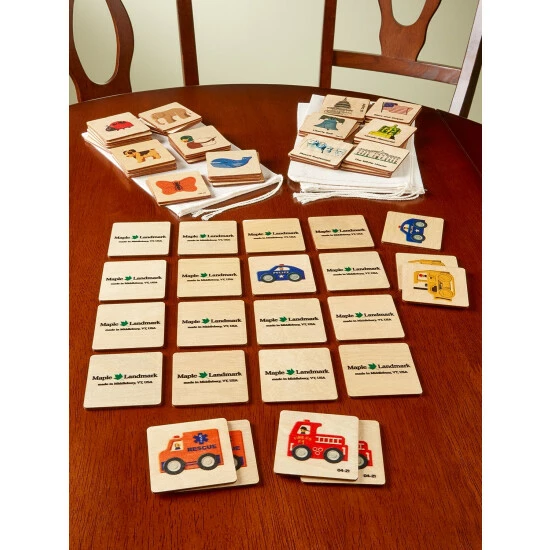 When it comes to developing a child’s memory, there’s not a simpler or more fun way than with these memory tile games. Each game has a different theme—transportation, animals, and patriotic symbols—and comes with 24 tiles (12 pairs) made of durable beech plywood with brightly colored images that kids match together. Also includes instructions and a cloth pouch for storage.