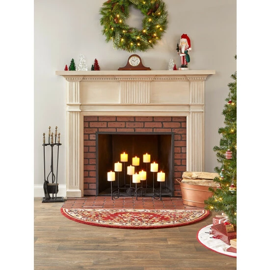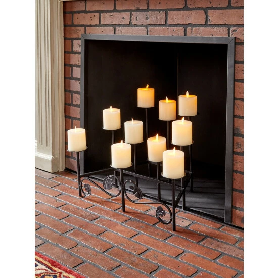You don’t have to give up the relaxing ambience of a fireplace during the warm summer months. This elegant wrought iron candelabra is designed wider at the front and narrower at the back to take the place of your fireplace grate. It holds ten pillar or globe candles at varying heights to cast a romantic flickering glow over your evenings. No need to worry about drips or messy ashes either.
